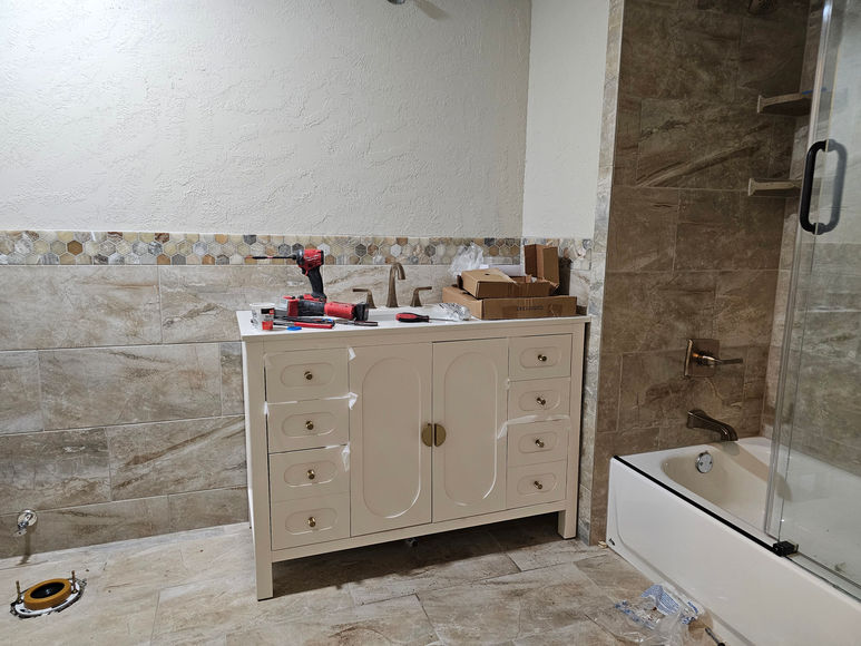 We began by carefully removing the old tub and fixtures to make room for the expanded shower footprint. From there, we completely replumbed the area to accommodate not one—but two custom shower heads and a ceiling-mounted rain shower for the ultimate at-home retreat.