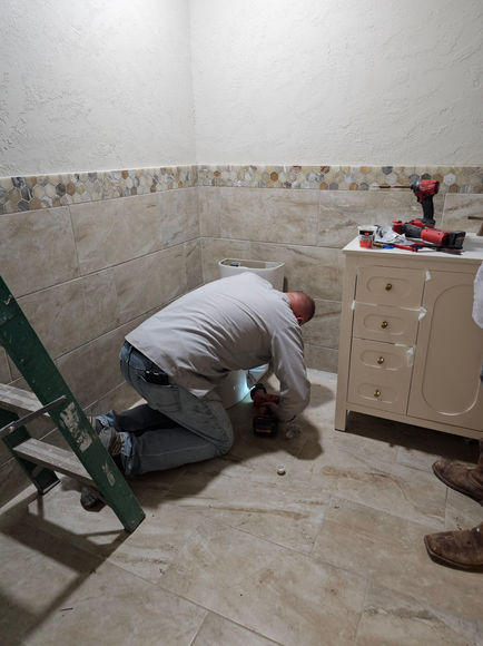 To complete the project, we installed new sinks and faucets from the customer’s selected vanity and reinstalled the toilet to match the fresh new space.